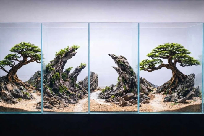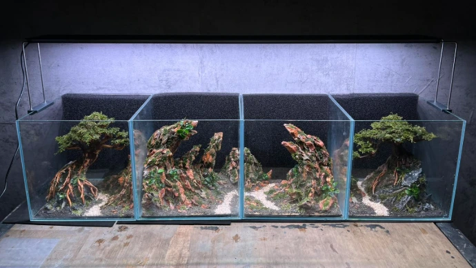 This layout connects four nano aquariums into a single immersive scene. Inspired by mountain landscapes, the composition uses layered stones and bonsai trees to guide the eye through a natural journey from one tank to another.
