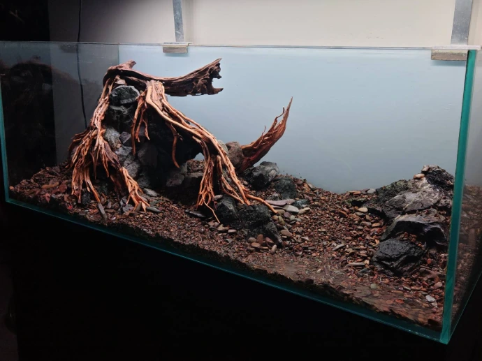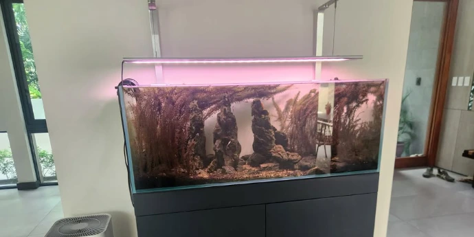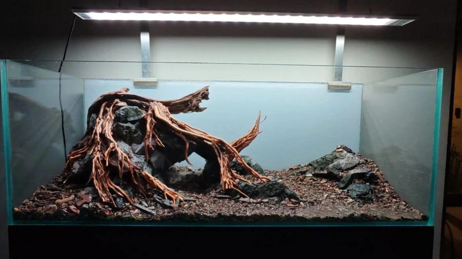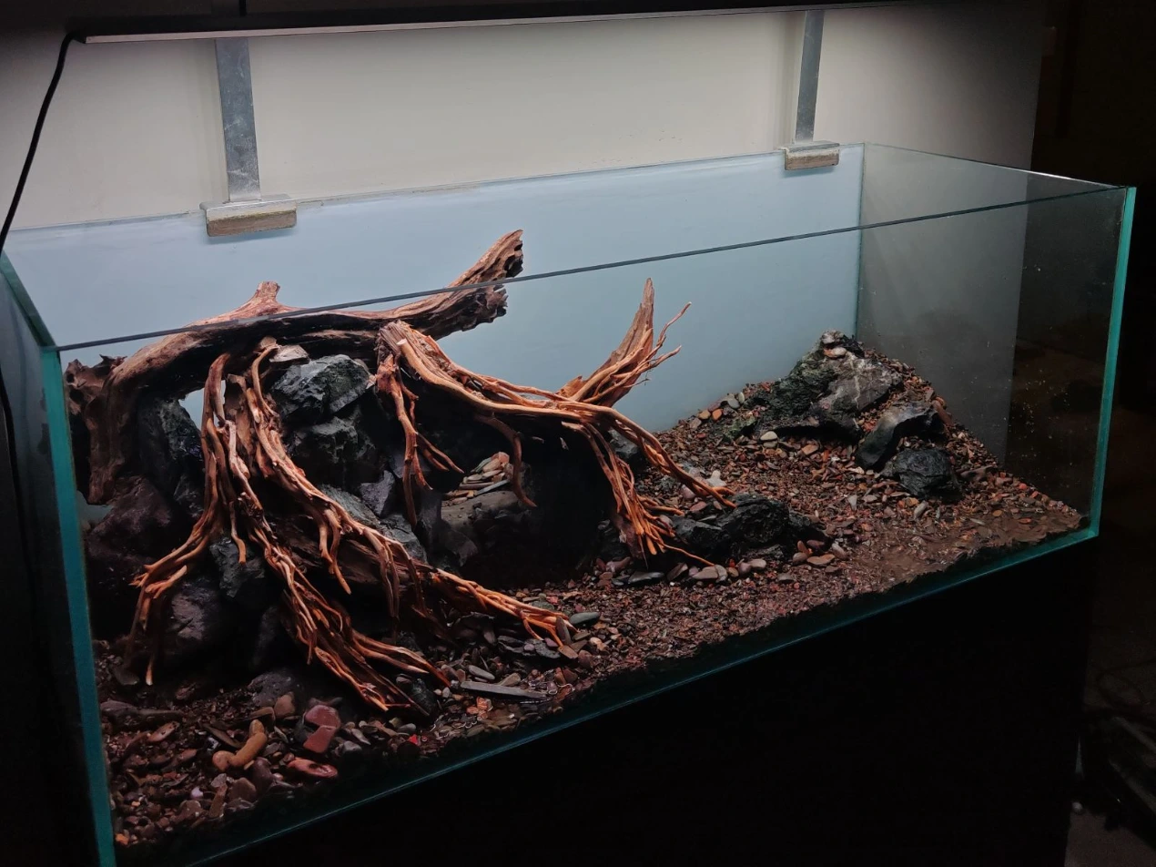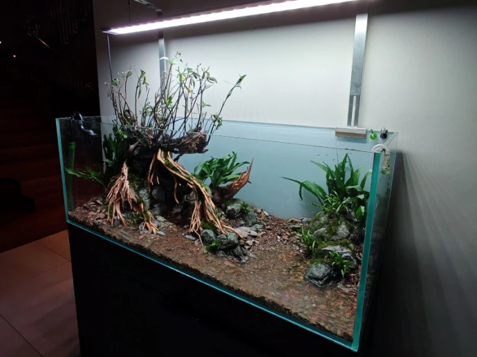 A client approached us with a request to redesign his existing 120 × 45 × 45 cm aquarium. The previous setup, while visually impressive, had become difficult to maintain over time. His goal was simple: create a clean, natural aquascape that would be easier to care for while still maintaining a strong visual presence in his living space.