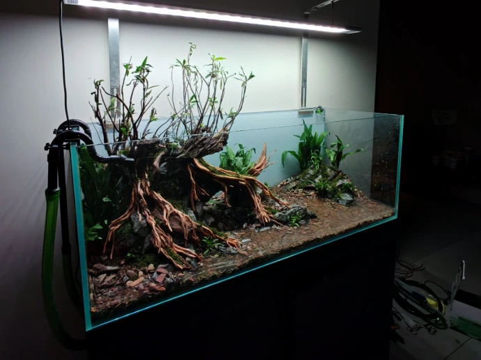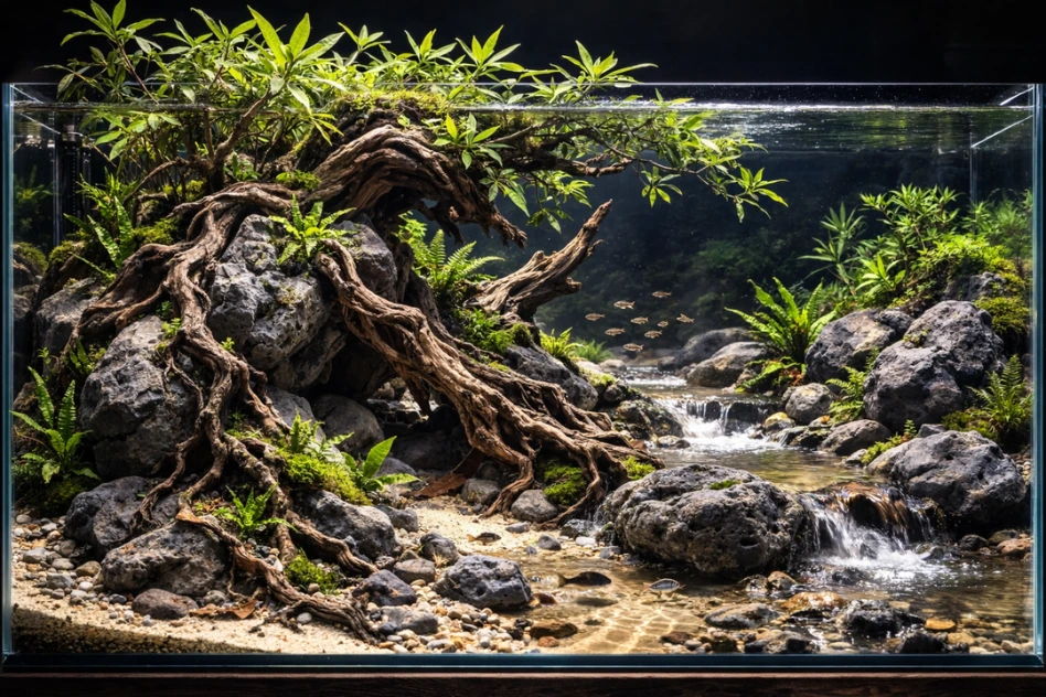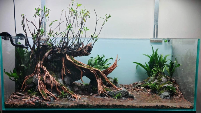 Low-maintenance plants such as Homonoia riparia, Java Fern, and Christmas moss were carefully placed to enhance the natural look while keeping the setup simple and practical for long-term care. The result is a calm riverside scene that blends rugged rock formations with flowing root structures, capturing the timeless beauty of nature within the aquarium.