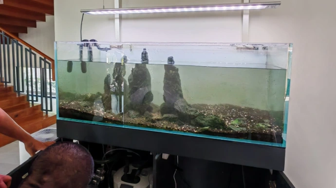 We arrived on site around 1:00 PM and began by thoroughly cleaning the aquarium to remove any debris and prepare the tank for the new layout. Once the glass and base were ready, we started building the hardscape by carefully positioning the main stone structures and driftwood elements.